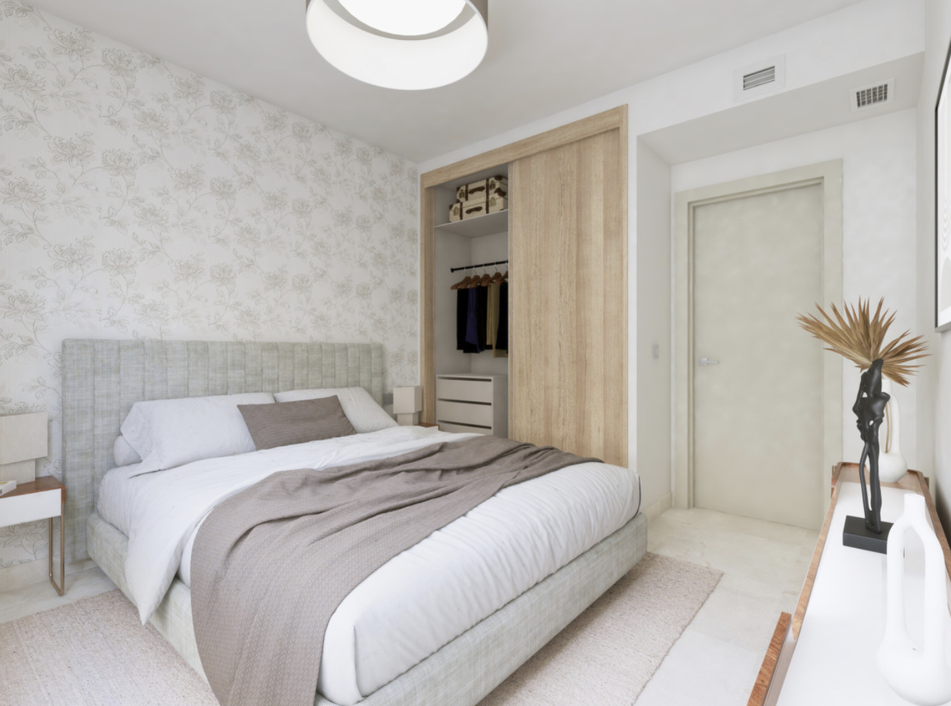 Inside, the apartments follow a contemporary “total living” concept, optimizing space with large living areas seamlessly connected to the terraces through expansive windows. High-quality finishes include built-in wardrobes, air conditioning, a fully fitted kitchen with appliances, LED lighting, and elegantly designed bathrooms. Additional customization options are available to tailor the space to individual preferences.